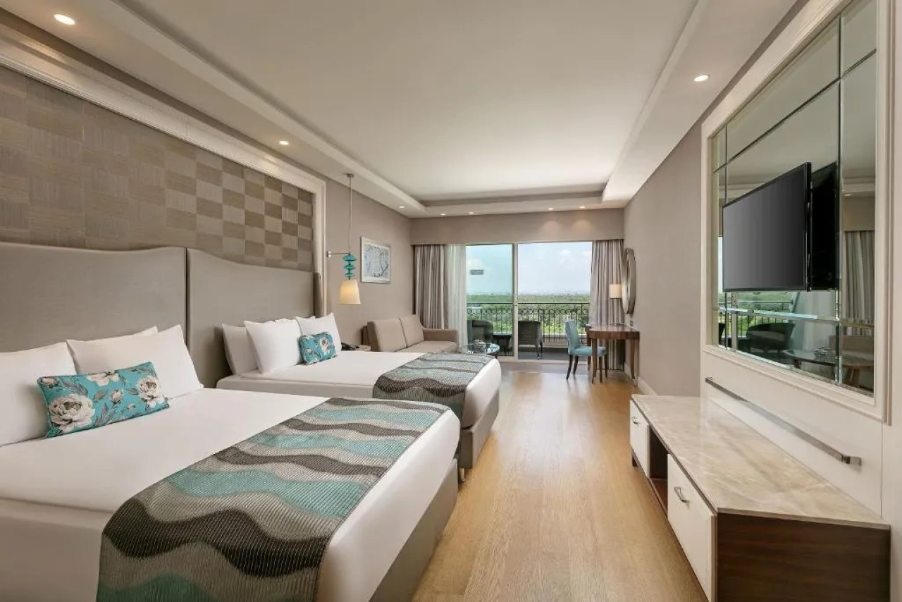 The hotel offers travellers a total of 600 rooms. A lobby and a reception are available to guests. Most storeys can be reached by lift. Wireless internet access (no extra charge) is available to travellers in the public areas. The hotel's culinary facilities include a restaurant, a dining area, a bar and a pub. Various shops are available, including a supermarket and a souvenir shop. The grounds of the establishment feature a playground and an attractive garden. Those arriving in their own vehicles can leave them in the car park of the accommodation. Additional services include multilingual staff, a babysitting service, a childcare service, translation services, room service, a laundry service and a hairdresser. In addition, a shuttle service is offered.Each of the rooms is appointed with air conditioning, a kitchen and a bathroom. Most rooms feature a balcony with a view for guests' enjoyment. The rooms have a double bed or a sofabed. Separate bedrooms are also available. Cots are available for younger guests. A safe and a minibar are also available. A mini fridge and a tea/coffee station ensure a comfortable stay. Internet access, a telephone, a TV, a DVD player and WiFi add to the comfort of the holiday. Slippers are laid out in each of the rooms. Amenities in the bathrooms include a shower. A hairdryer, a vanity mirror and bathrobes are provided for everyday use. The hotel offers family rooms and non-smoking rooms.A refreshing dip in the indoor or outdoor pool is an enjoyable way to cool down on hot days. A waterslide offers fun for all ages. A sun terrace, sun loungers and parasols are also available. The hot tub is the perfect place to relax. There is also a poolside snack bar. Variety is provided by the wide range of sporting activities offered at the establishment, for example biking/mountain biking, tennis, bocce, beach volleyball, volleyball, basketball, golf and archery. Water sports enthusiasts can enjoy canoeing and aquafit. Travellers at the accommodation can choose from a range of indoor sporting activities, including a gym, table tennis, billiards, darts, yoga and aerobics, or for a fee, bowling. Various wellness options are available at the hotel, including a spa, a sauna, a steam bath, a hammam, a beauty salon and massage treatments. Other options and services include an entertainment programme, a disco, a kids' club and a nightclub. Copyright GIATA 2004 - 2017. Multilingual, powered by www.giata.com for client no. 125125All-inclusive is bookable. Breakfast, lunch and dinner are available. The establishment also offers snacks. Options include alcohol-free drinks and alcoholic beverages.The following credit cards are accepted at the accommodation: American Express, VISA and MasterCard.